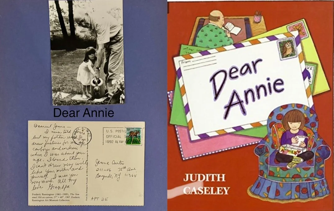 In Dear Annie, published by Greenwillow Books in 1991, I wrote about a little girl, my daughter Jenna, whose grandfather writes her letters. For several years, Jenna received postcards and ditties from her Grandpa Lester that she kept in a shoebox. We still have the letters, safe and sound in the Stride-right box that stored them. Striving for authenticity, I copied some of them and put them in the book. Grandpa Lester’s letters made the story authentic because they came from the heart of a loving grandparent.